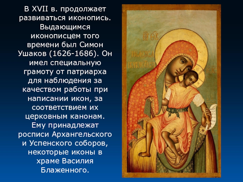 Симон Ушаков (1626-1686). Он имел специальную грамоту от патриарха для наблюдения за качеством работы при написании икон, за соответствием их церковным канонам. Ему принадлежат росписи Архангельского и Успенского соборов, некоторые иконы в храме Василия Блаженного.