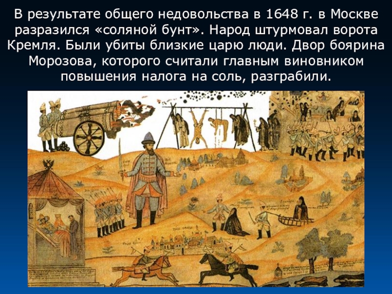 бунт». Народ штурмовал ворота Кремля. Были убиты близкие царю люди. Двор боярина Морозова, которого считали главным виновником повышения налога на соль, разграбили.
