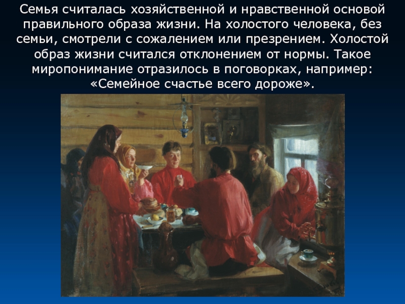 Слайд 35Семья считалась хозяйственной и нравственной основой правильного образа жизни. На холостого