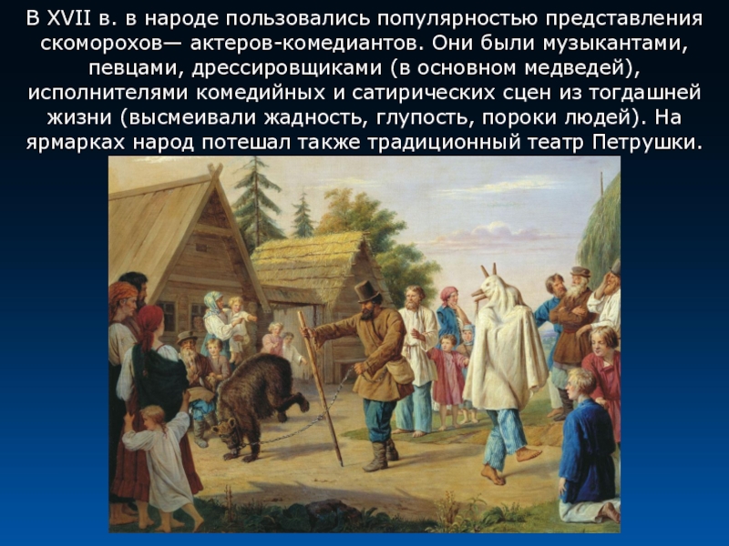 Слайд 50В XVII в. в народе пользовались популярностью представления скоморохов— актеров-комедиантов. Они