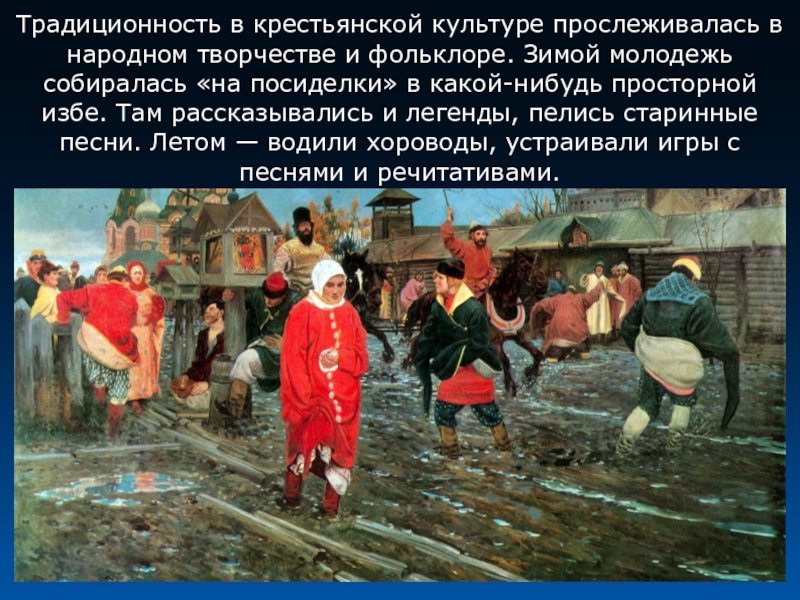 Слайд 36Традиционность в крестьянской культуре прослеживалась в народном творчестве и фольклоре. Зимой