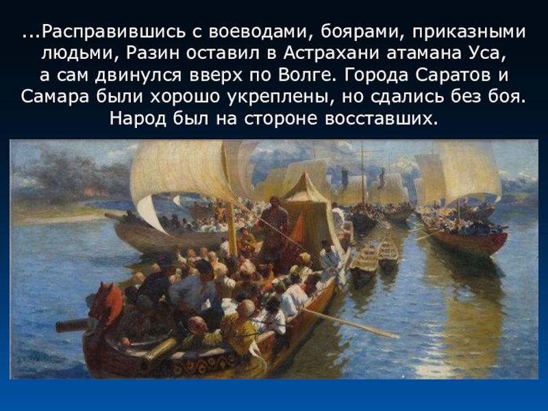 Слайд 13...Расправившись с воеводами, боярами, приказными людьми, Разин оставил в Астрахани атамана