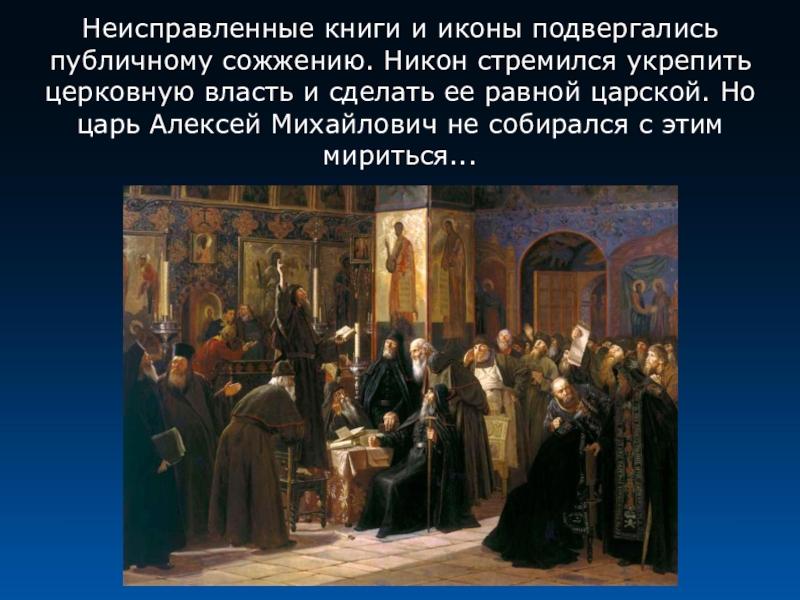 Слайд 19Неисправленные книги и иконы подвергались публичному сожжению. Никон стремился укрепить церковную