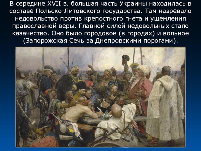 государства. Там назревало недовольство против крепостного гнета и ущемления православной веры. Главной силой недовольных стало казачество. Оно было городовое (в городах) и вольное (Запорожская Сечь за Днепровскими порогами).