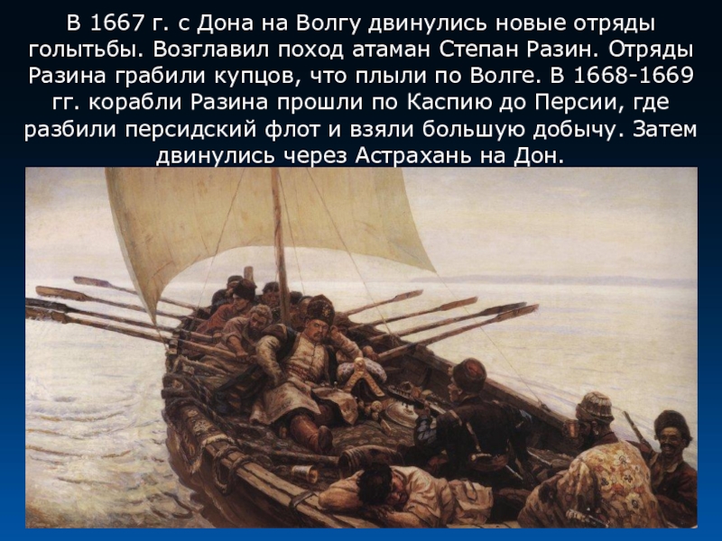 Возглавил поход атаман Степан Разин. Отряды Разина грабили купцов, что плыли по Волге. В 1668-1669 гг. корабли Разина прошли по Каспию до Персии, где разбили персидский флот и взяли большую добычу. Затем двинулись через Астрахань на Дон.