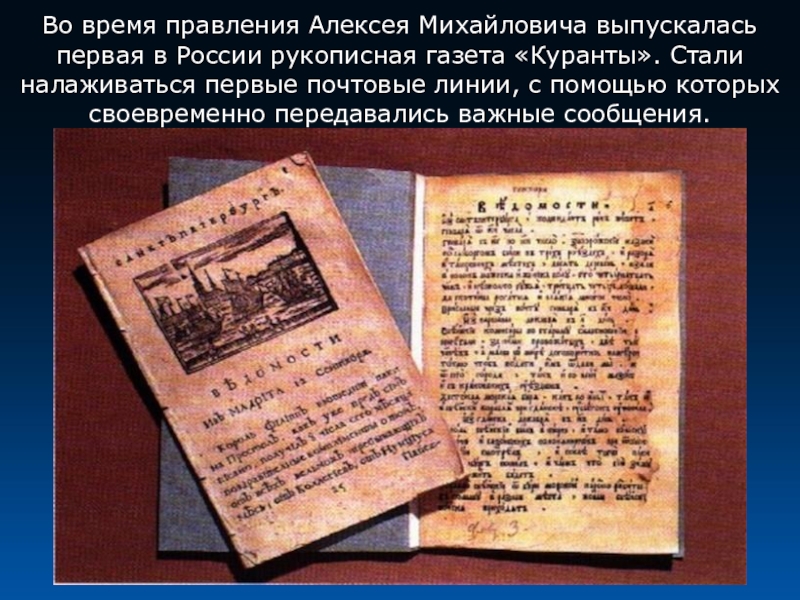 Слайд 43Во время правления Алексея Михайловича выпускалась первая в России рукописная газета