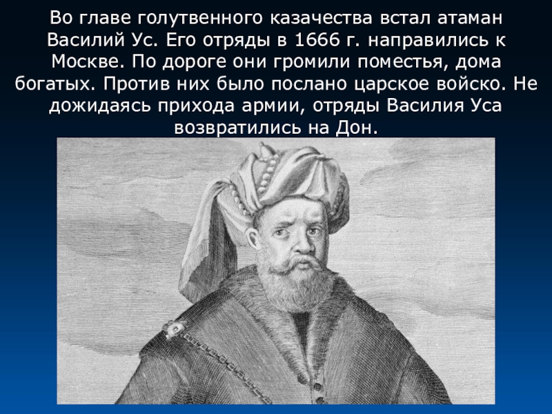 Слайд 11Во главе голутвенного казачества встал атаман Василий Ус. Его отряды в