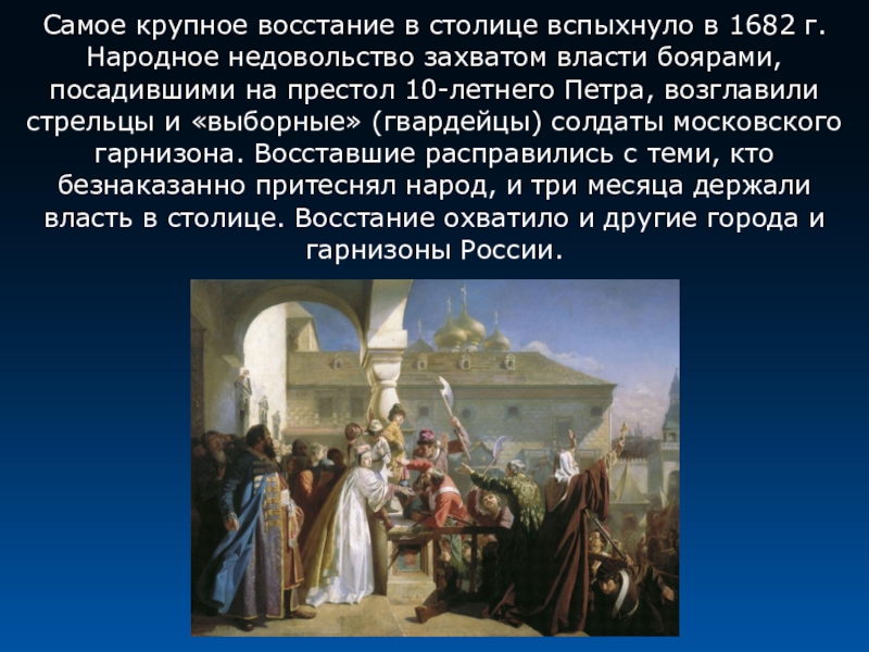захватом власти боярами, посадившими на престол 10-летнего Петра, возглавили стрельцы и «выборные» (гвардейцы) солдаты московского гарнизона. Восставшие расправились с теми, кто безнаказанно притеснял народ, и три месяца держали власть в столице. Восстание охватило и другие города и гарнизоны России.