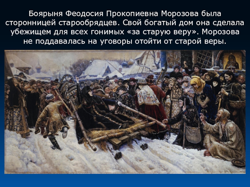 Слайд 23Боярыня Феодосия Прокопиевна Морозова была сторонницей старообрядцев. Свой богатый дом она