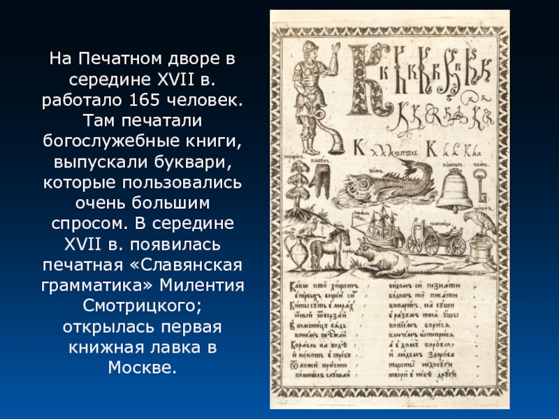 печатали богослужебные книги, выпускали буквари, которые пользовались очень большим спросом. В середине XVII в. появилась печатная «Славянская
