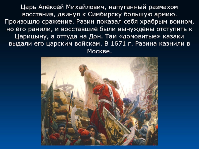 Произошло сражение. Разин показал себя храбрым воином, но его ранили, и восставшие были вынуждены отступить к Царицыну, а оттуда на Дон. Там «домовитые» казаки выдали его царским войскам. В 1671 г. Разина казнили в Москве.