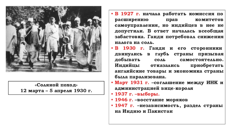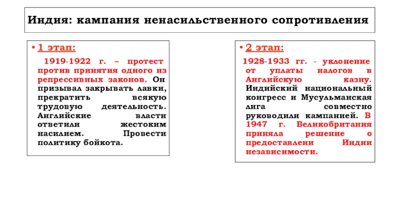 1928-1933 гг. - уклонение от уплаты налогов в Английскую казну. Индийский национальный конгресс и Мусульманская лига совместно руководили кампанией. В 1947 г. Великобритания приняла решение о предоставлени Индии независимости.
