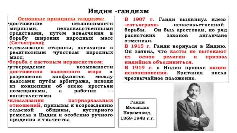 В 1915 г. Ганди вернулся в Индию. Он заявил, что касты не вытекают из основ религии и призвал индийцев объединиться.