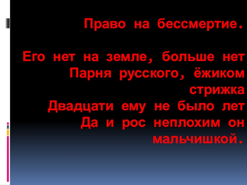Слайд 4Право на бессмертие. Его нет на земле, больше нет Парня русского, ёжиком стрижка Двадцати