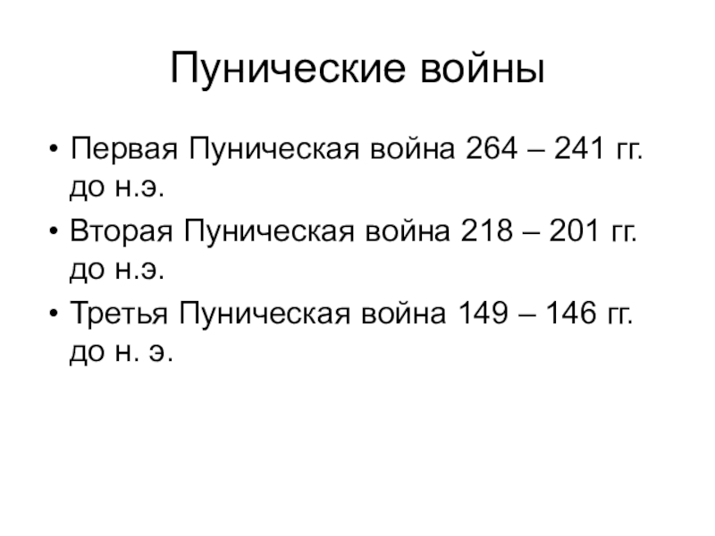Пунические войныПервая Пуническая война 264 – 241 гг. до н.э.Вторая Пуническая война 218 – 201 гг. до