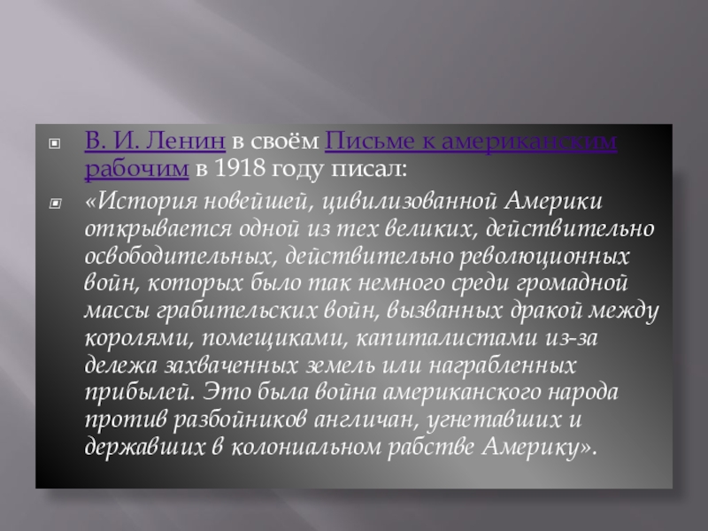 Слайд 12В. И. Ленин в своём Письме к американским рабочим в 1918 году писал: