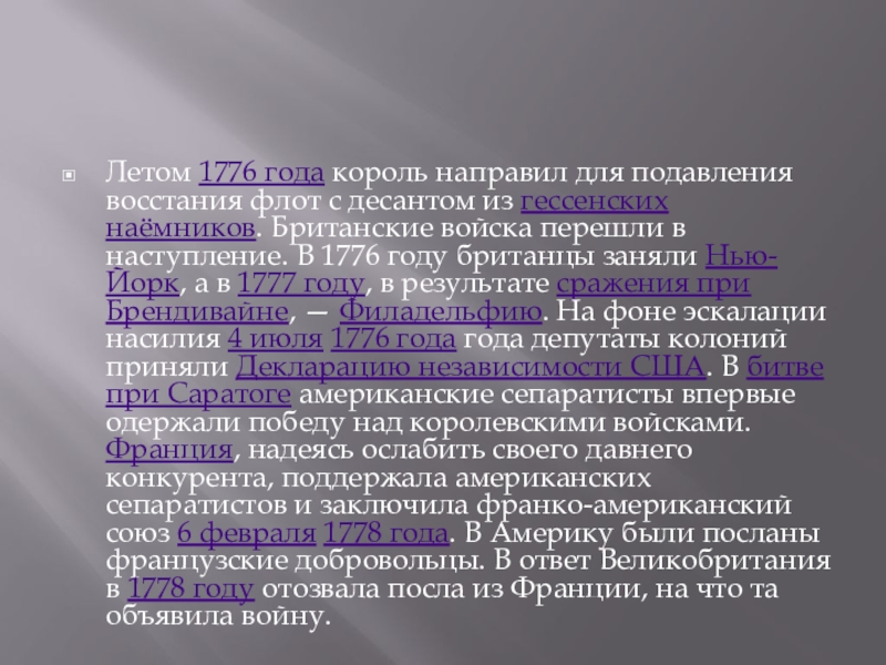 из гессенских наёмников. Британские войска перешли в наступление. В 1776 году британцы заняли Нью-Йорк, а в 1777 году, в результате сражения при Брендивайне, — Филадельфию. На фоне эскалации насилия 4 июля 1776 года года депутаты колоний приняли Декларацию независимости США. В битве при Саратоге американские сепаратисты впервые одержали победу над королевскими войсками. Франция, надеясь ослабить своего давнего конкурента, поддержала американских сепаратистов и заключила франко-американский союз 6 февраля 1778 года. В Америку были посланы французские добровольцы. В ответ Великобритания в 1778 году отозвала посла из Франции, на что та объявила войну.