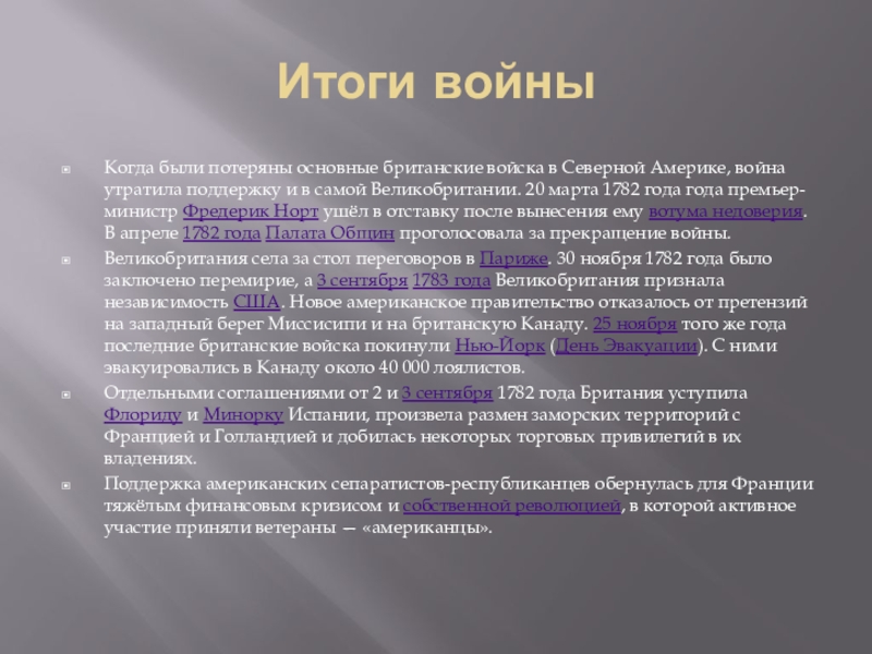 Великобритания села за стол переговоров в Париже. 30 ноября 1782 года было заключено перемирие, а 3 сентября 1783 года Великобритания признала независимость США. Новое американское правительство отказалось от претензий на западный берег Миссисипи и на британскую Канаду. 25 ноября того же года последние британские войска покинули Нью-Йорк (День Эвакуации). С ними эвакуировались в Канаду около 40 000 лоялистов.