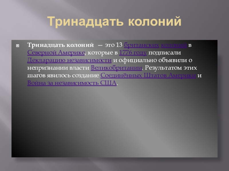Тринадцать колоний — это 13 британских колоний в Северной Америке,