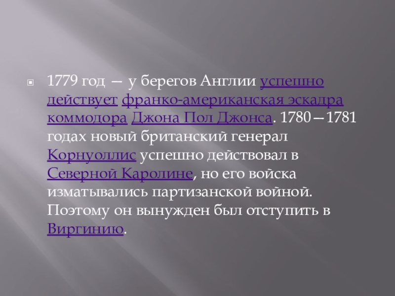 Пол Джонса. 1780—1781 годах новый британский генерал Корнуоллис успешно действовал в Северной Каролине, но его войска изматывались партизанской войной. Поэтому он вынужден был отступить в Виргинию.