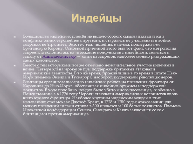 европейцев с другими, и старались не участвовать в войне, сохраняя нейтралитет. Вместе с тем, индейцы, в целом, поддерживали Британскую Корону. Основной причиной этого был тот факт, что метрополия запрещала колонистам, во избежание конфликтов с индейцами, селиться к западу от Аппалачских гор — один из запретов, наиболее сильно раздражавших самих колонистов.