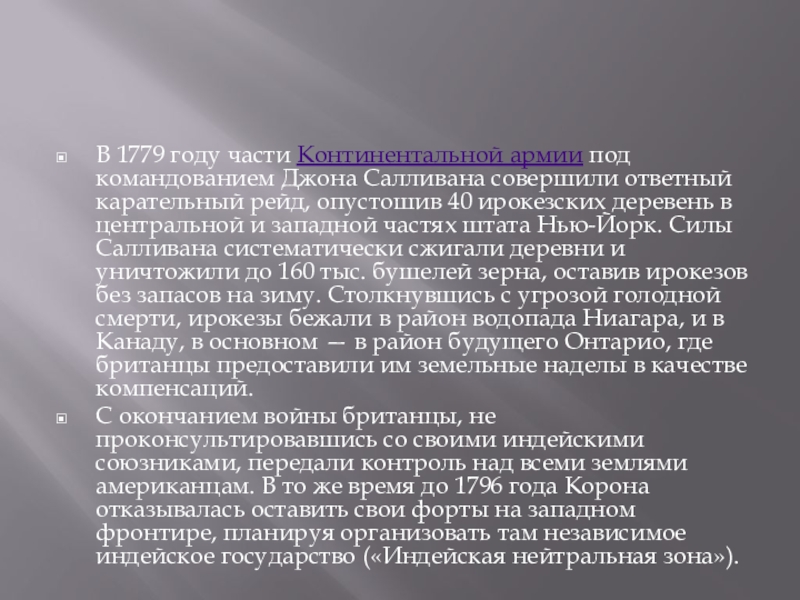 Слайд 15В 1779 году части Континентальной армии под командованием Джона Салливана совершили