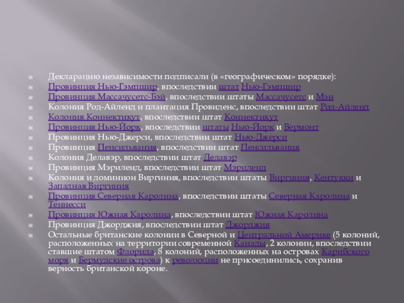 Слайд 19Декларацию независимости подписали (в «географическом» порядке):