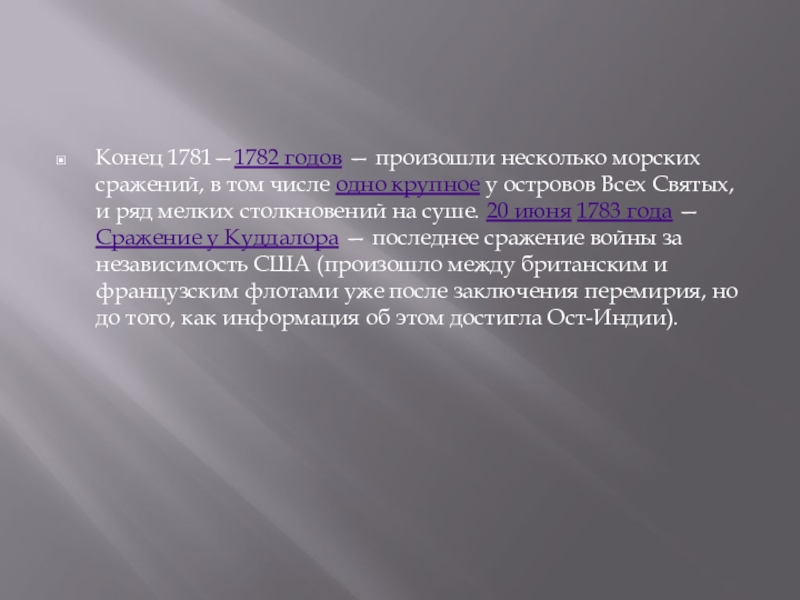 Слайд 10Конец 1781—1782 годов — произошли несколько морских сражений, в том числе одно