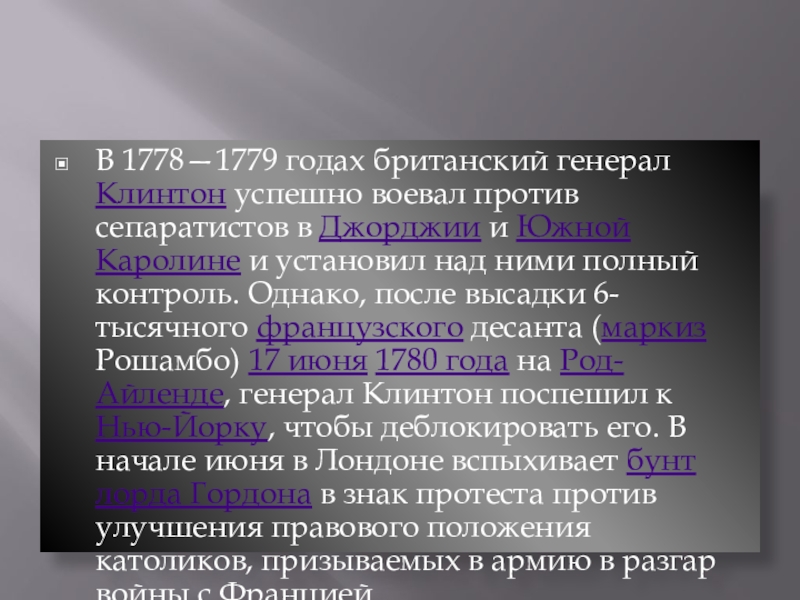 Слайд 6В 1778—1779 годах британский генерал Клинтон успешно воевал против сепаратистов в