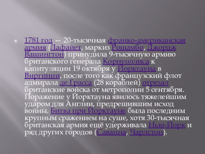 Слайд 81781 год — 20-тысячная франко-американская армия (Лафайет, маркиз Рошамбо, Джордж Вашингтон) принудила