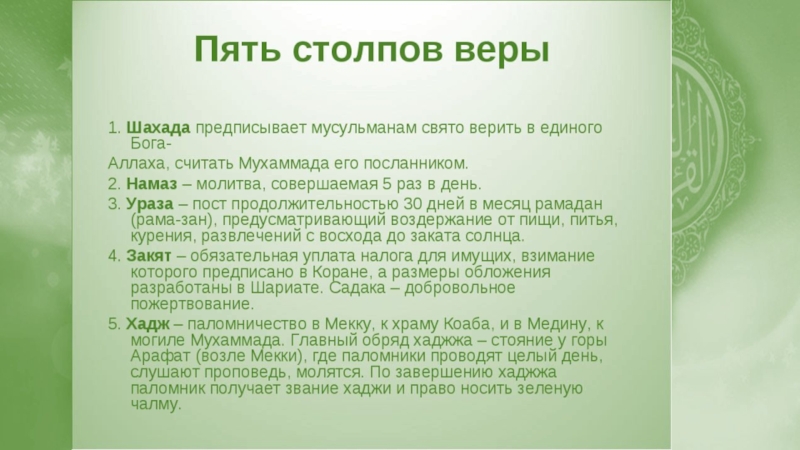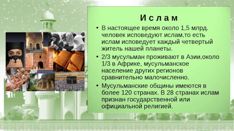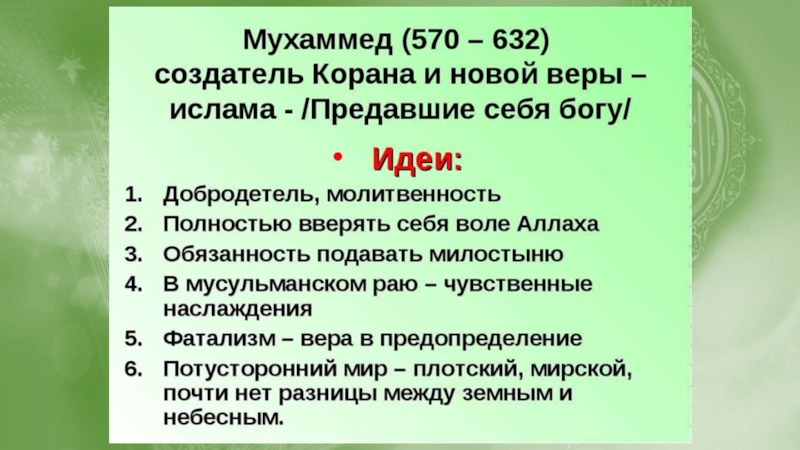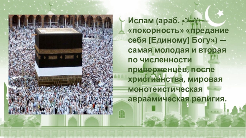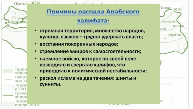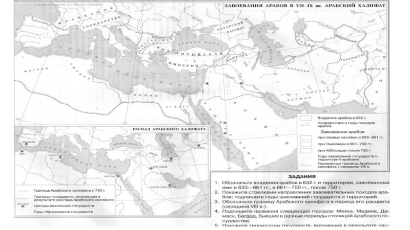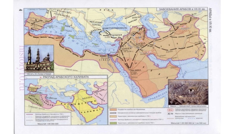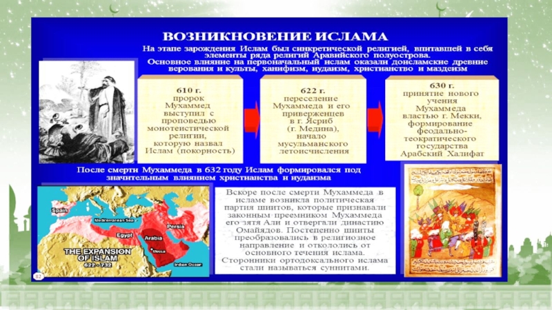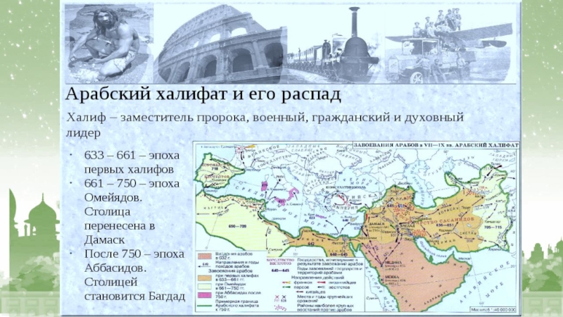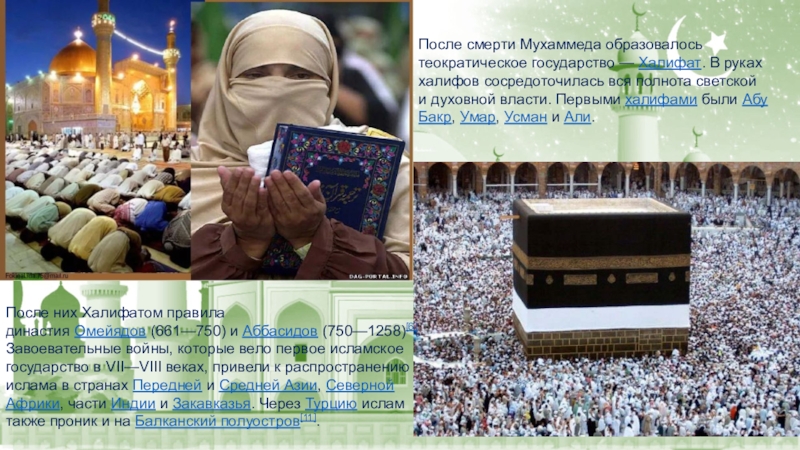 После них Халифатом правила династия Омейядов (661—750) и Аббасидов (750—1258)[6]. Завоевательные войны, которые вело первое исламское государство в VII—VIII веках, привели к распространению ислама в странах Передней и Средней Азии, Северной Африки, части Индии и Закавказья. Через Турцию ислам также проник и на Балканский полуостров[11].