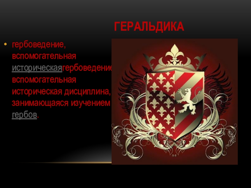 ГЕРАЛЬДИКАгербоведение, вспомогательная историческаягербоведение, вспомогательная историческая дисциплина, занимающаяся изучением гербов.