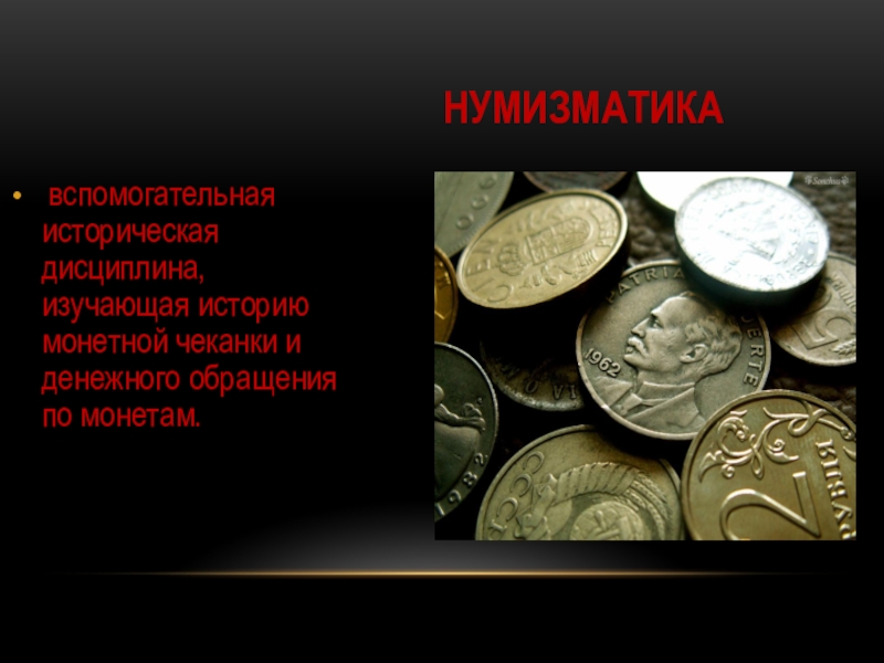 вспомогательная историческая дисциплина, изучающая историю монетной чеканки и денежного обращения