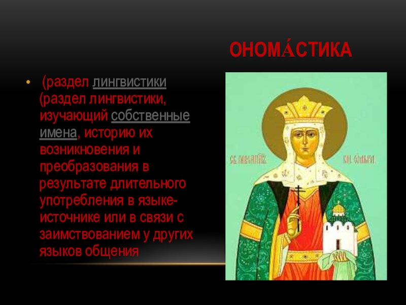 ОНОМА́СТИКА (раздел лингвистики(раздел лингвистики, изучающий собственные имена, историю их возникновения и преобразования в результате длительного употребления в