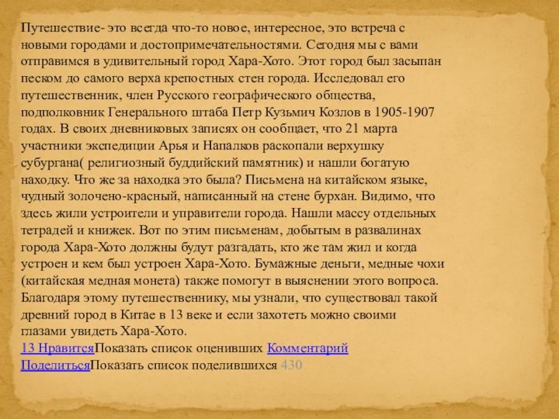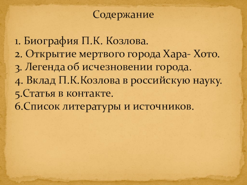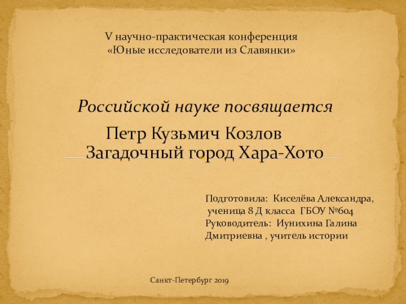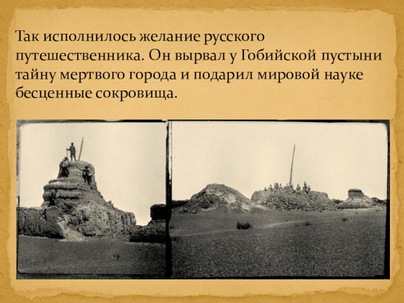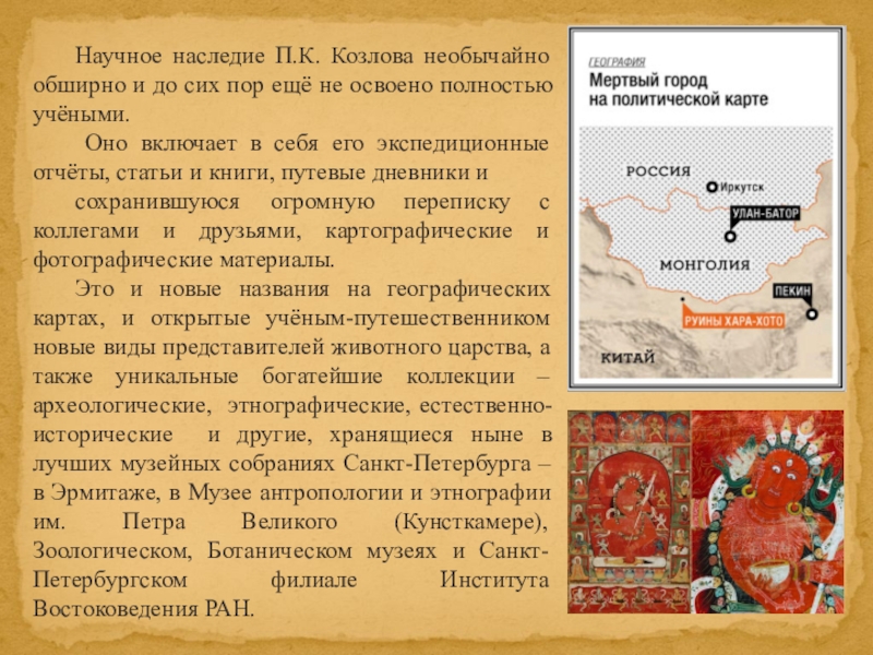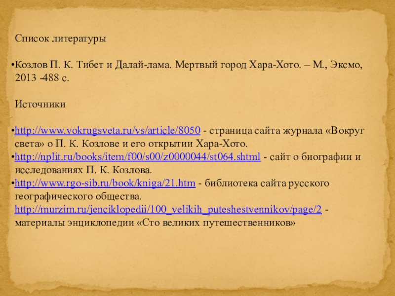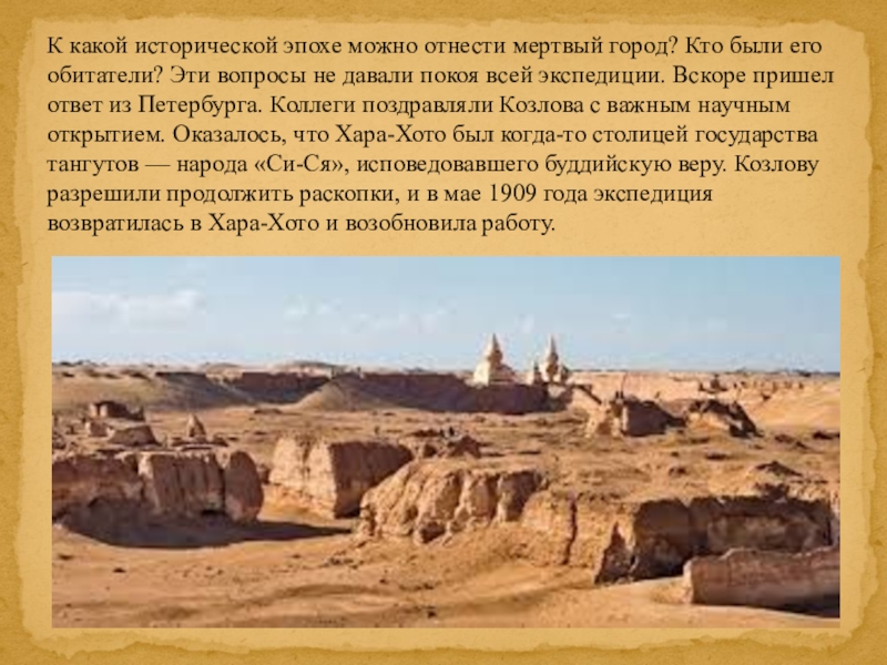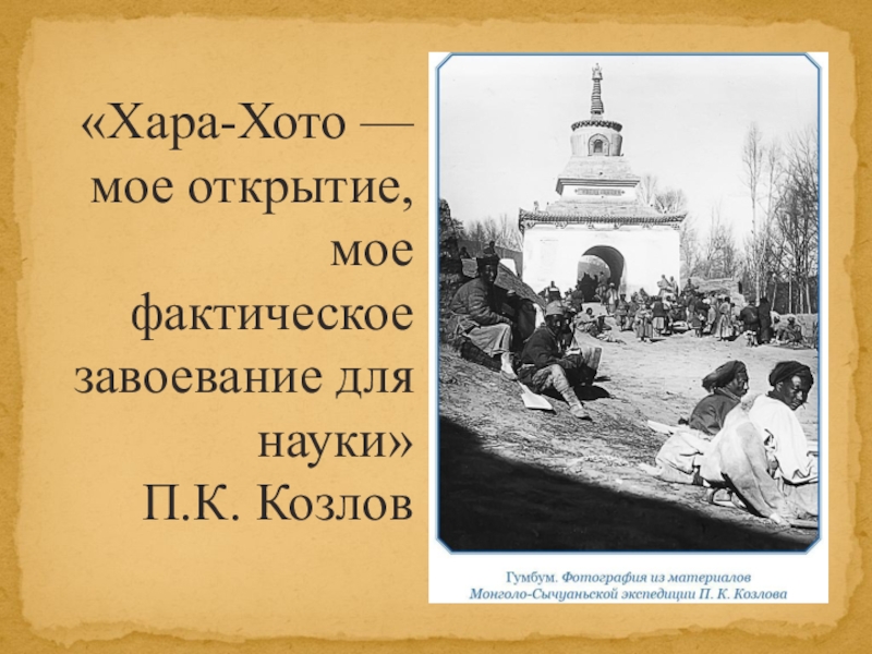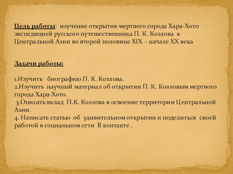 Цель работы: изучение открытия мертвого города Хара-Хото экспедицией русского путешественника П. К. Козлова в Центральной Азии во второй половине XIX – начале XX века