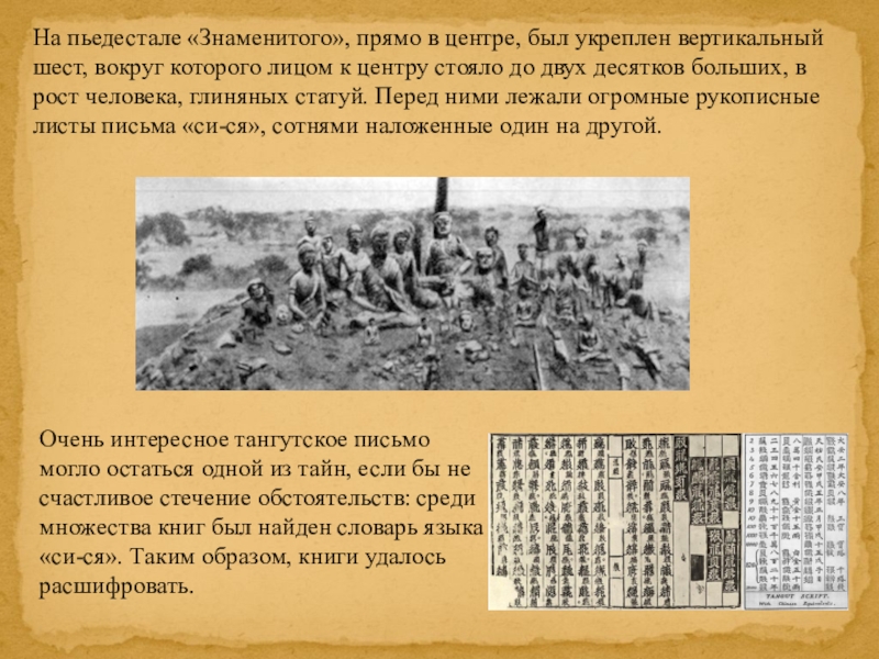 Очень интересное тангутское письмо могло остаться одной из тайн, если бы не счастливое стечение обстоятельств: среди множества книг был найден словарь языка «си-ся». Таким образом, книги удалось расшифровать.