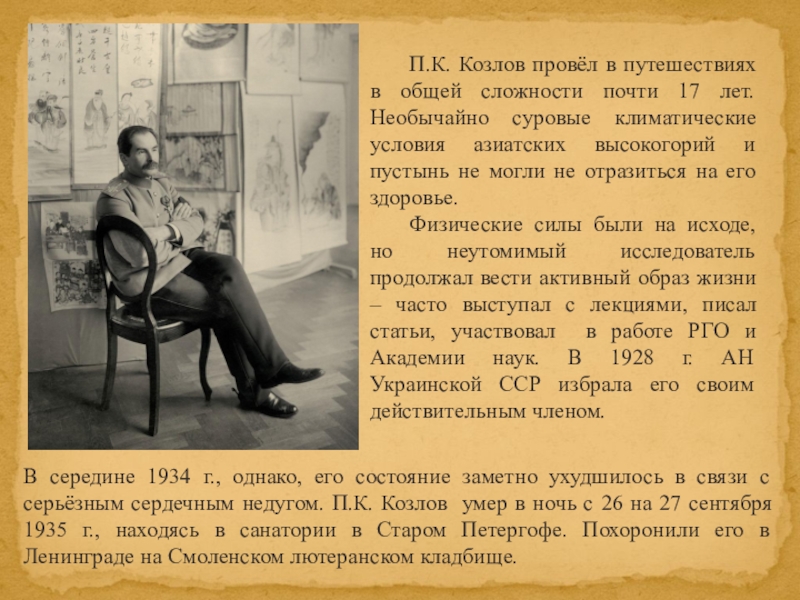 В середине 1934 г., однако, его состояние заметно ухудшилось в связи с серьёзным сердечным недугом. П.К. Козлов умер в ночь с 26 на 27 сентября 1935 г., находясь в санатории в Старом Петергофе. Похоронили его в Ленинграде на Смоленском лютеранском кладбище.