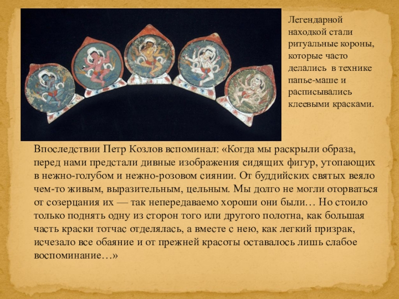 Легендарной находкой стали ритуальные короны, которые часто делались в технике папье-маше и расписывались клеевыми красками.