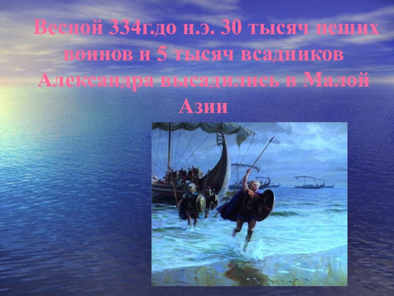 Слайд 3Весной 334г.до н.э. 30 тысяч пеших воинов и 5 тысяч всадников