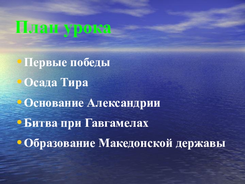 План урокаПервые победыОсада ТираОснование АлександрииБитва при ГавгамелахОбразование Македонской державы