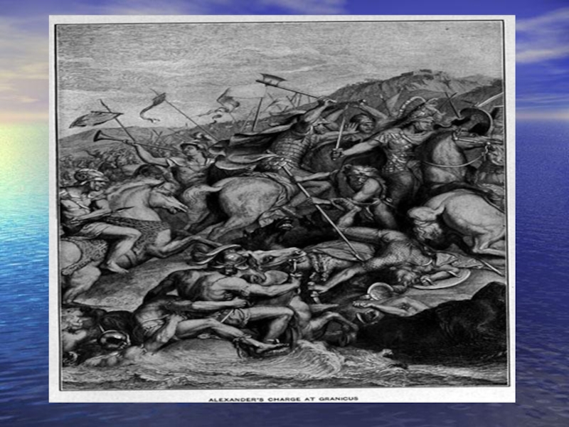 Слайд 5На обрывистом берегу реки Граник персы преградили путь македонской армии. Александр