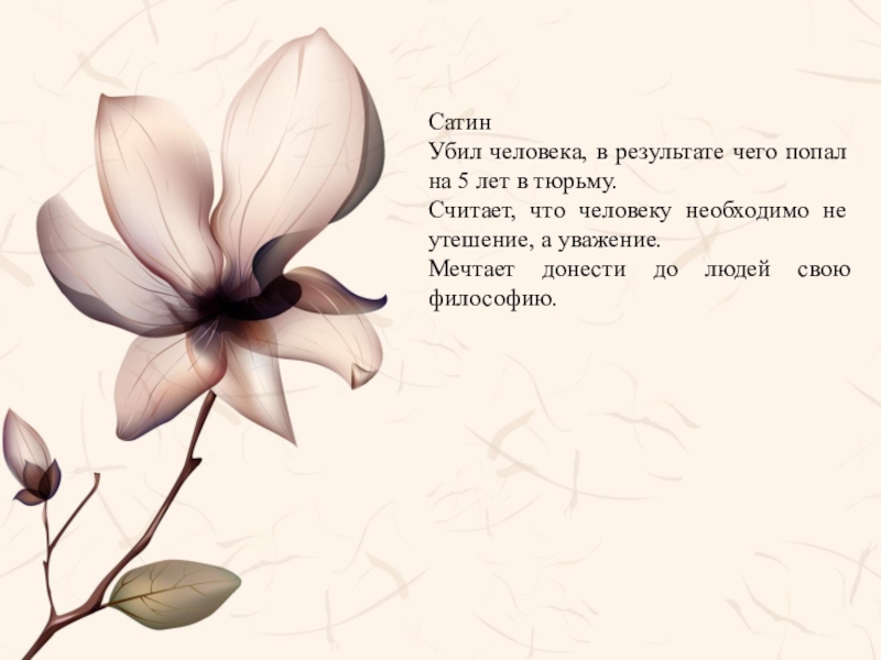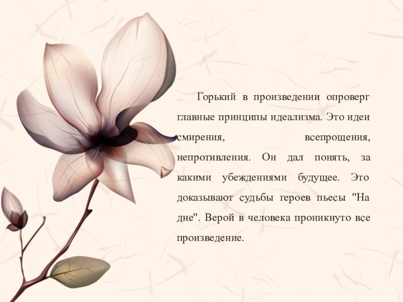 Слайд 13Горький в произведении опроверг главные принципы идеализма. Это идеи смирения, всепрощения,