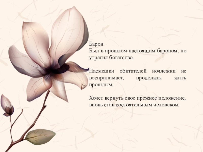 Был в прошлом настоящим бароном, но утратил богатство.