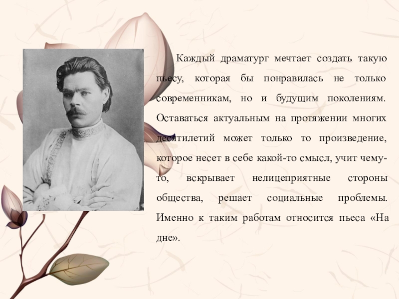 современникам, но и будущим поколениям. Оставаться актуальным на протяжении многих десятилетий может только то произведение, которое несет в себе какой-то смысл, учит чему-то, вскрывает нелицеприятные стороны общества, решает социальные проблемы. Именно к таким работам относится пьеса «На дне».