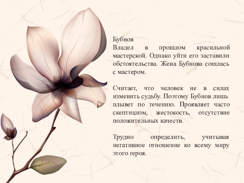 Считает, что человек не в силах изменить судьбу. Поэтому Бубнов лишь плывет по течению. Проявляет часто скептицизм, жестокость, отсутствие положительных качеств.