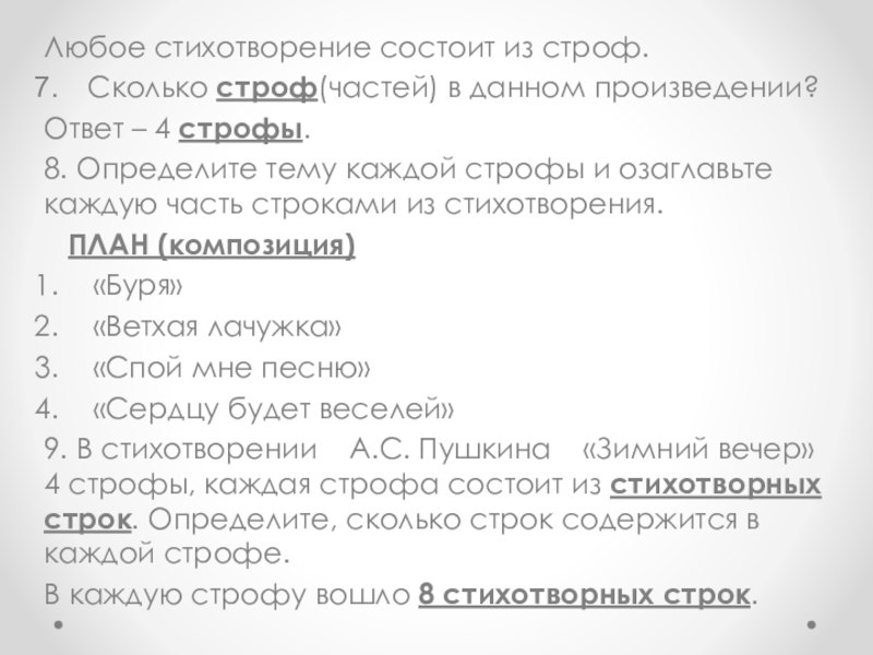 9. В стихотворении А.С. Пушкина «Зимний вечер» 4 строфы, каждая строфа состоит из стихотворных строк. Определите, сколько строк содержится в каждой строфе.