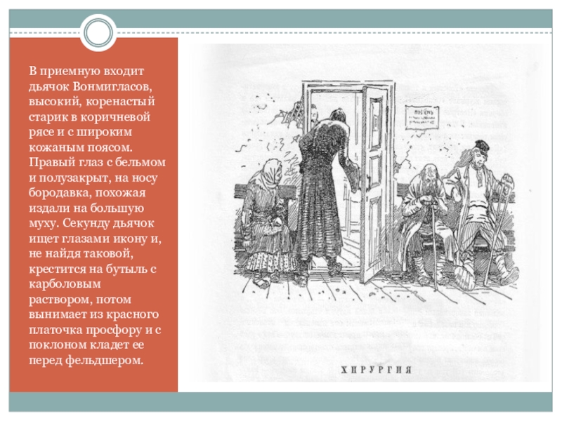 Слайд 13В приемную входит дьячок Вонмигласов, высокий, коренастый старик в коричневой рясе
