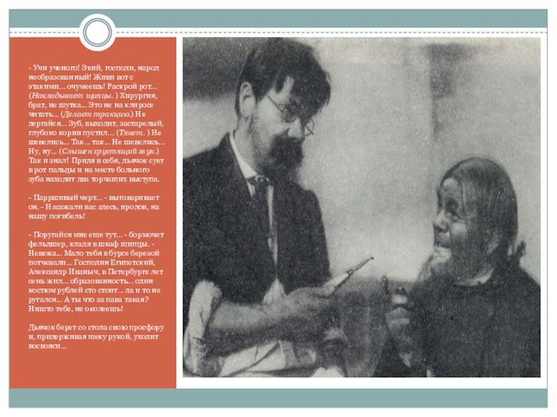 - Поругайся мне еще тут... - бормочет фельдшер, кладя в шкаф щипцы. - Невежа... Мало тебя в бурсе березой потчевали... Господин Египетский, Александр Иваныч, в Петербурге лет семь жил... образованность... один костюм рублей сто стоит... да и то не ругался... А ты что за пава такая? Ништо тебе, не околеешь!