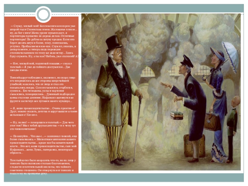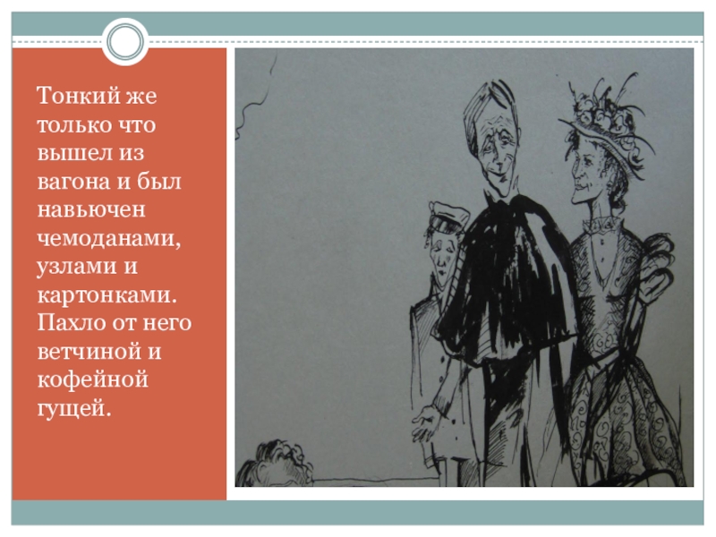 Слайд 3Тонкий же только что вышел из вагона и был навьючен чемоданами,