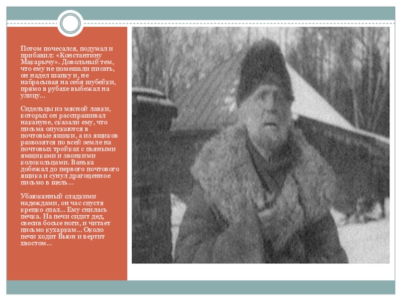 Слайд 10Потом почесался, подумал и прибавил: «Константину Макарычу». Довольный тем, что ему